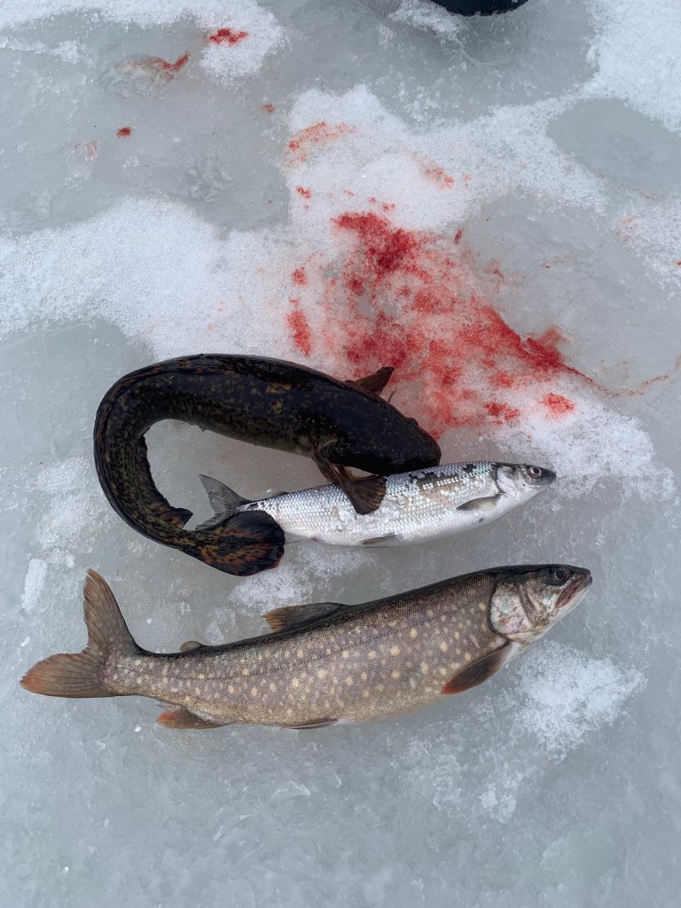 The final part of this story is something unexpected. As I mentioned, there was no record of Burbot being in this lake. I don’t think this is overly rare as they are often forgotten about and I doubt were even being looked for in surveys. Another thing is that they are bottom-oriented. Like Channel Catfish and others, the netting sets in surveys are discriminatory to bottom-dwelling fish and they are often undercounted in the overall biomass counts. Using the same lure as previous, I saw a mark on the sonar that looked like it was glued to the bottom. I stopped my high jigging cadence meant for Lake Trout and focused on tapping the bottom. All of a sudden, something snapped it up and after a short trip, a Burbot appeared at the hole. This was my first Burbot and is so memorable, because it wrapped its long tail around my arm as I was trying to take the hook out. They are a remarkable fish with a single whisker on the bottom of their jaw and such a unique look to them. Forget what you have heard about rough fish, because Burbot are one species that has broken through the glass ceiling of edibility. Poor Man’s Lobster is a common name that people use for the meat, but having had lobster in my life, I wouldn’t take it that far! Love these fish, but that is a high bar to meet.